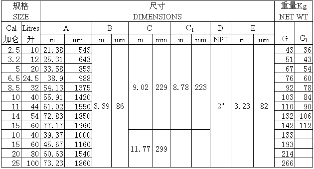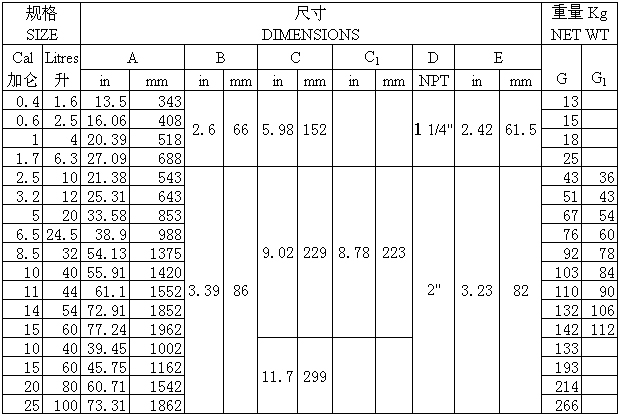型 号 | 公称容积/L | 公称通径/mm | 公称压力/MPa |